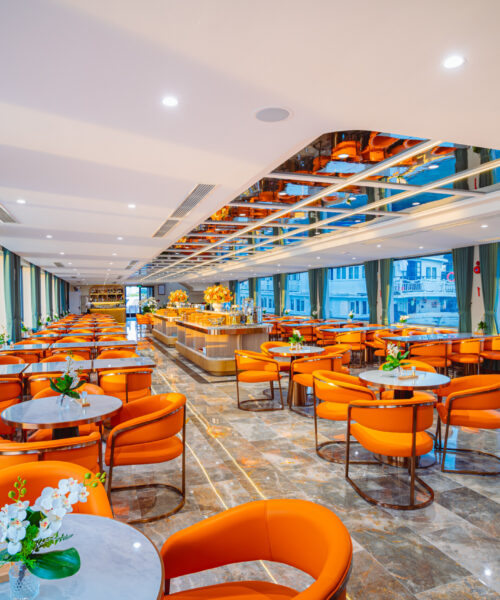 12:15 – 14:15 Savor a carefully crafted set menu, designed by expert Vietnamese chefs, in the elegant setting of the Bayview Dining Restaurant. As the cruise glides through the heart of Ha Long Bay, enjoy breathtaking views of iconic landmarks such as Hon Trong Mai and Hon Ngon Tay.